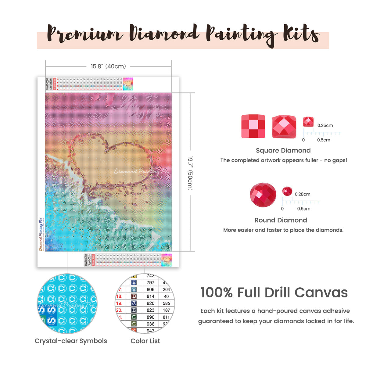 Full Drill Canvas (15.8"x19.7" / 40x50cm): Immerse yourself in the full diamond painting experience with the perfect canvas size for detailed masterpieces. Crafted with care using premium HD quality tarpaulin canvas, it's durable, waterproof, moisture-proof, and wrinkle-free, ensuring a stress-free painting process. Crystal-clear symbols provide easy guidance, while poured-glue canvas adhesive secures your diamonds, maintaining pattern visibility with the transparent cover.