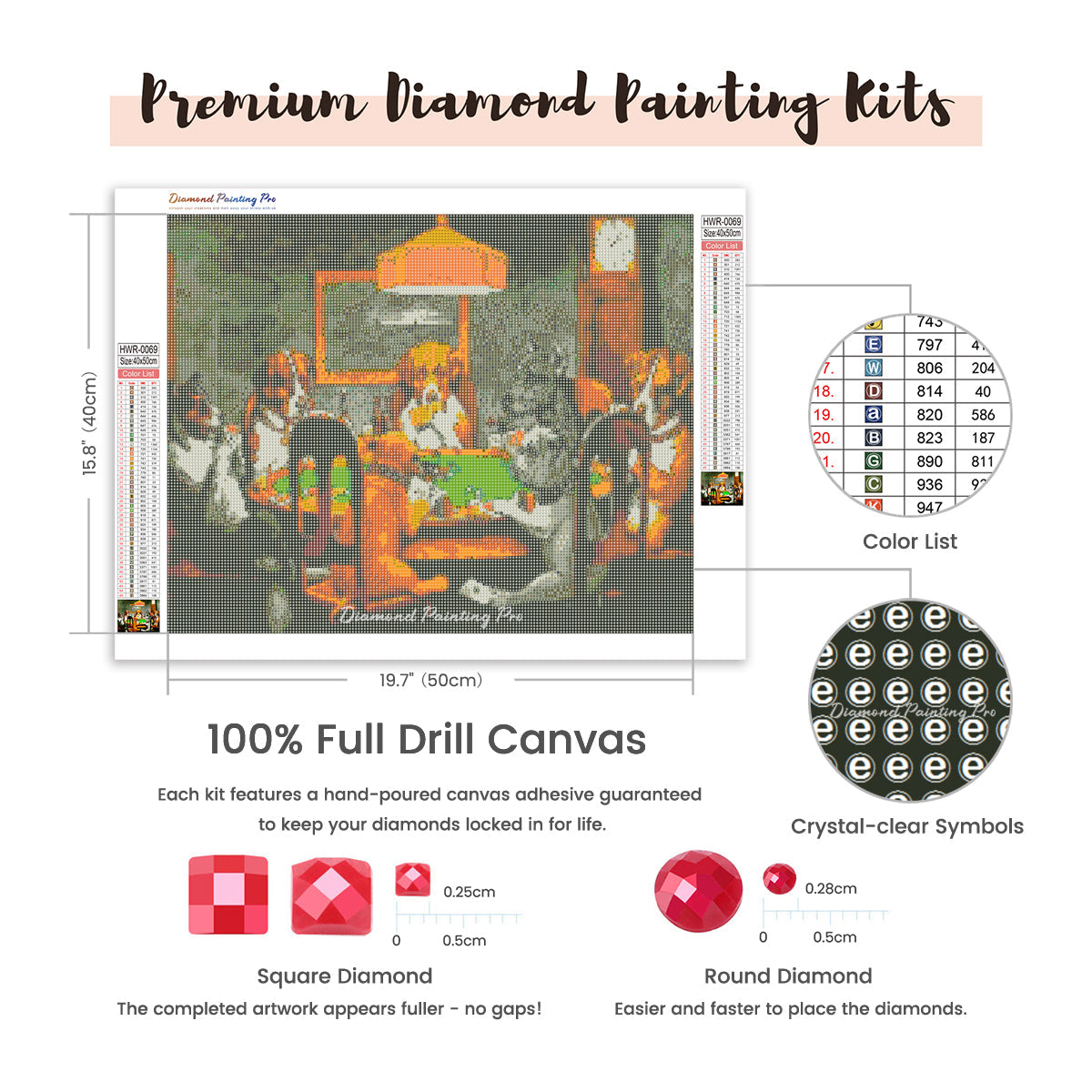Full Drill Canvas (15.8"x19.7" / 40x50cm): Immerse yourself in the full diamond painting experience with the perfect canvas size for detailed masterpieces. Crafted with care using premium HD quality tarpaulin canvas, it's durable, waterproof, moisture-proof, and wrinkle-free, ensuring a stress-free painting process. Crystal-clear symbols provide easy guidance, while poured-glue canvas adhesive secures your diamonds, maintaining pattern visibility with the transparent cover.