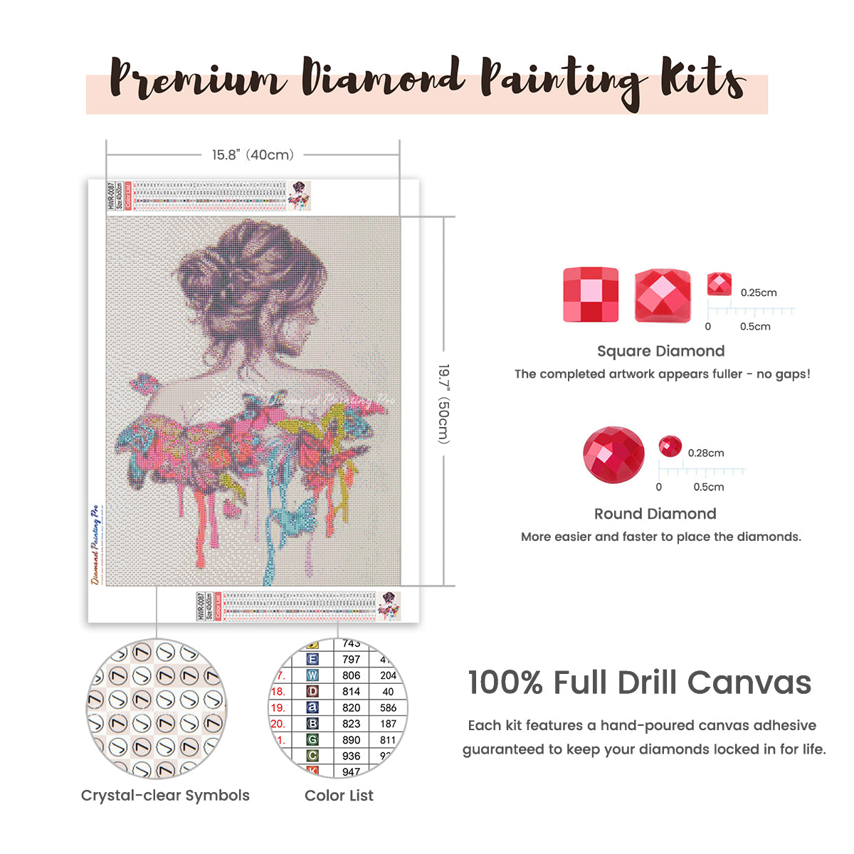 Full Drill Canvas (15.8"x19.7" / 40x50cm): Immerse yourself in the full diamond painting experience with the perfect canvas size for detailed masterpieces. Crafted with care using premium HD quality tarpaulin canvas, it's durable, waterproof, moisture-proof, and wrinkle-free, ensuring a stress-free painting process. Crystal-clear symbols provide easy guidance, while poured-glue canvas adhesive secures your diamonds, maintaining pattern visibility with the transparent cover.