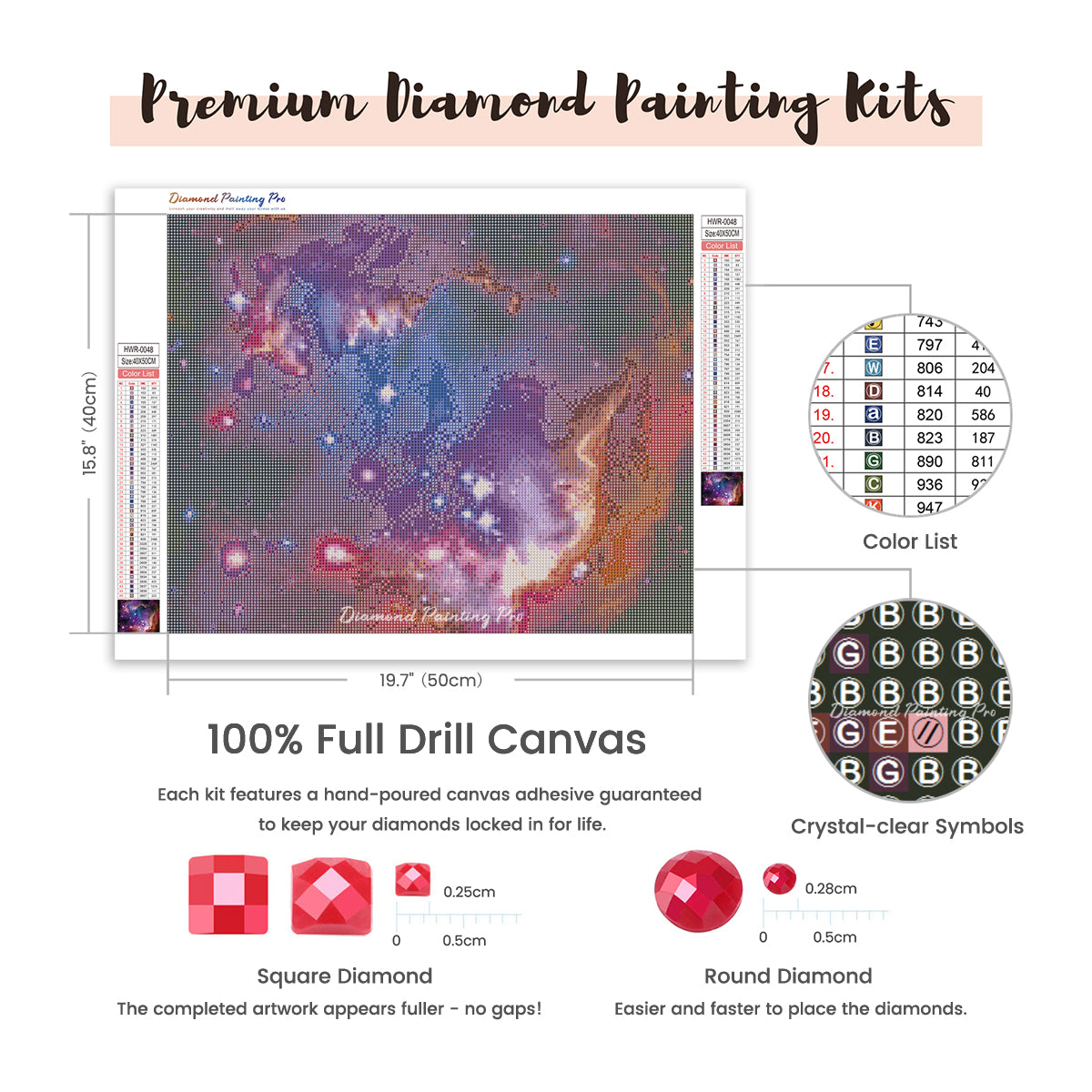 Full Drill Canvas (15.8"x19.7" / 40x50cm): Immerse yourself in the full diamond painting experience with the perfect canvas size for detailed masterpieces. Crafted with care using premium HD quality tarpaulin canvas, it's durable, waterproof, moisture-proof, and wrinkle-free, ensuring a stress-free painting process. Crystal-clear symbols provide easy guidance, while poured-glue canvas adhesive secures your diamonds, maintaining pattern visibility with the transparent cover.