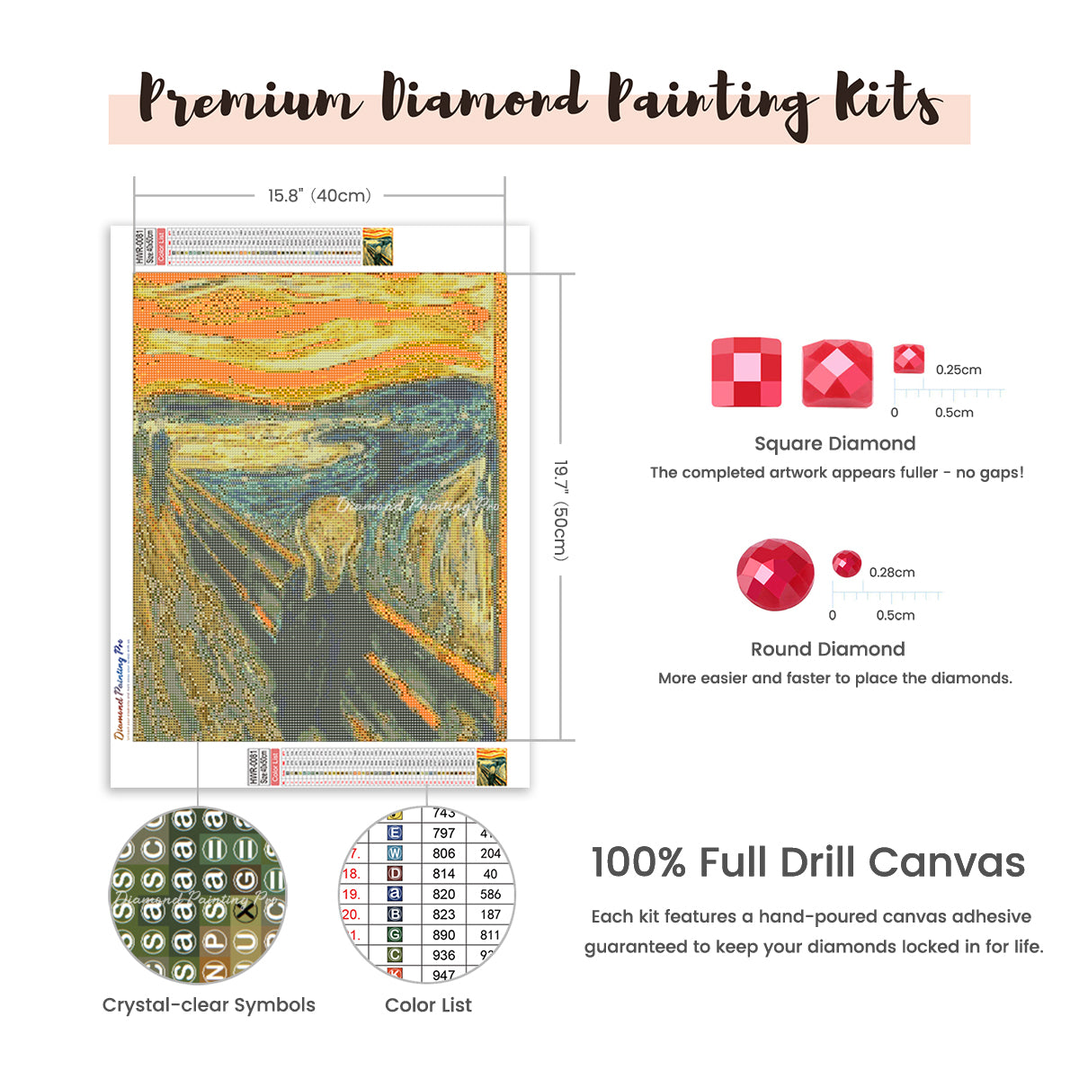 Full Drill Canvas (15.8"x19.7" / 40x50cm): Immerse yourself in the full diamond painting experience with the perfect canvas size for detailed masterpieces. Crafted with care using premium HD quality tarpaulin canvas, it's durable, waterproof, moisture-proof, and wrinkle-free, ensuring a stress-free painting process. Crystal-clear symbols provide easy guidance, while poured-glue canvas adhesive secures your diamonds, maintaining pattern visibility with the transparent cover.