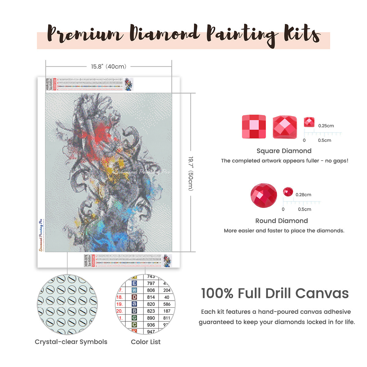 Full Drill Canvas (15.8"x19.7" / 40x50cm): Immerse yourself in the full diamond painting experience with the perfect canvas size for detailed masterpieces. Crafted with care using premium HD quality tarpaulin canvas, it's durable, waterproof, moisture-proof, and wrinkle-free, ensuring a stress-free painting process. Crystal-clear symbols provide easy guidance, while poured-glue canvas adhesive secures your diamonds, maintaining pattern visibility with the transparent cover.